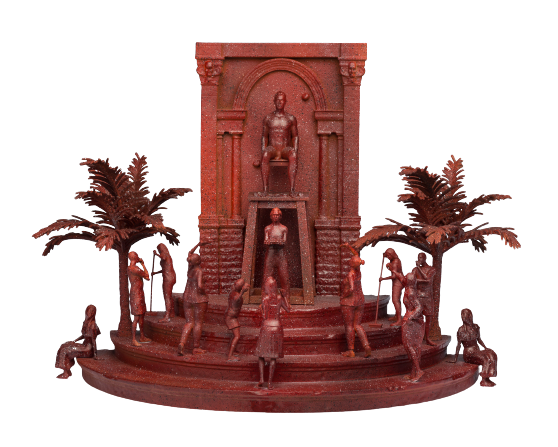 These five sculptural pieces aim to capture and condense the essence of one performance piece each into a physical object. The seemingly oxymoronic nature of this project – translating time-based forms of expression into intransigent physical works – raises important questions about the interaction between the artist’s work and the viewer. Presenting themselves with beguiling decorativeness on the surface, upon closer scrutiny the intricately sculpted works draw the spectator into a game of discovery, using the profane as a prop to lure the eye from the surface towards the sacred.